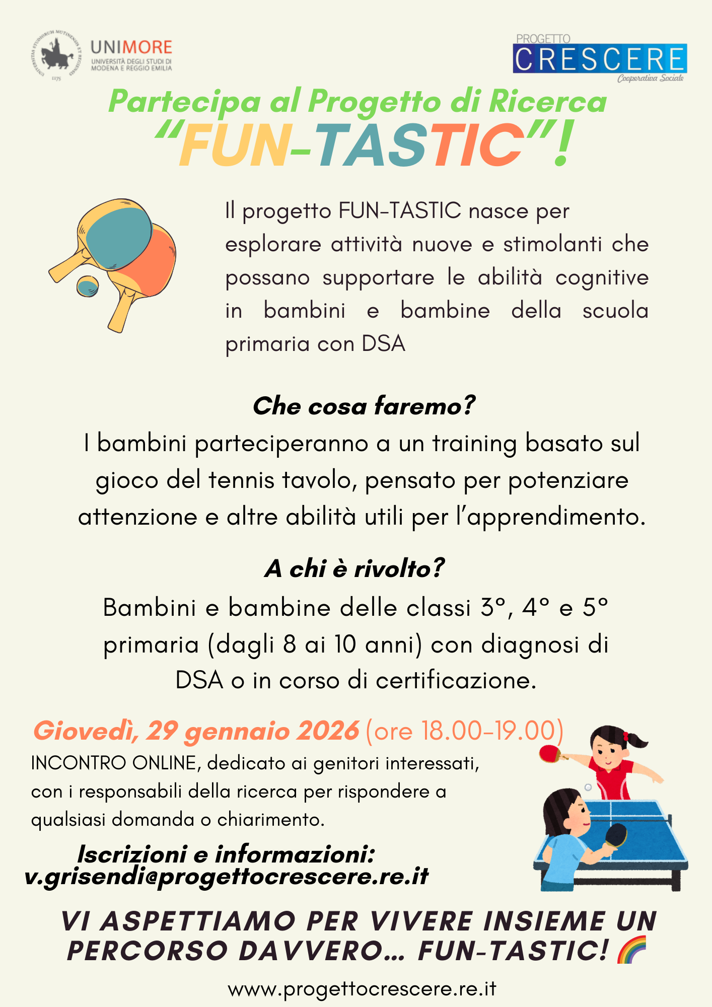 Giovedì, 29 gennaio 2026 (ore 18.00-19.00) INCONTRO ONLINE, dedicato ai genitori interessati con i responsabili della ricerca per rispondere a qualsiasi domanda o chiarimento.
